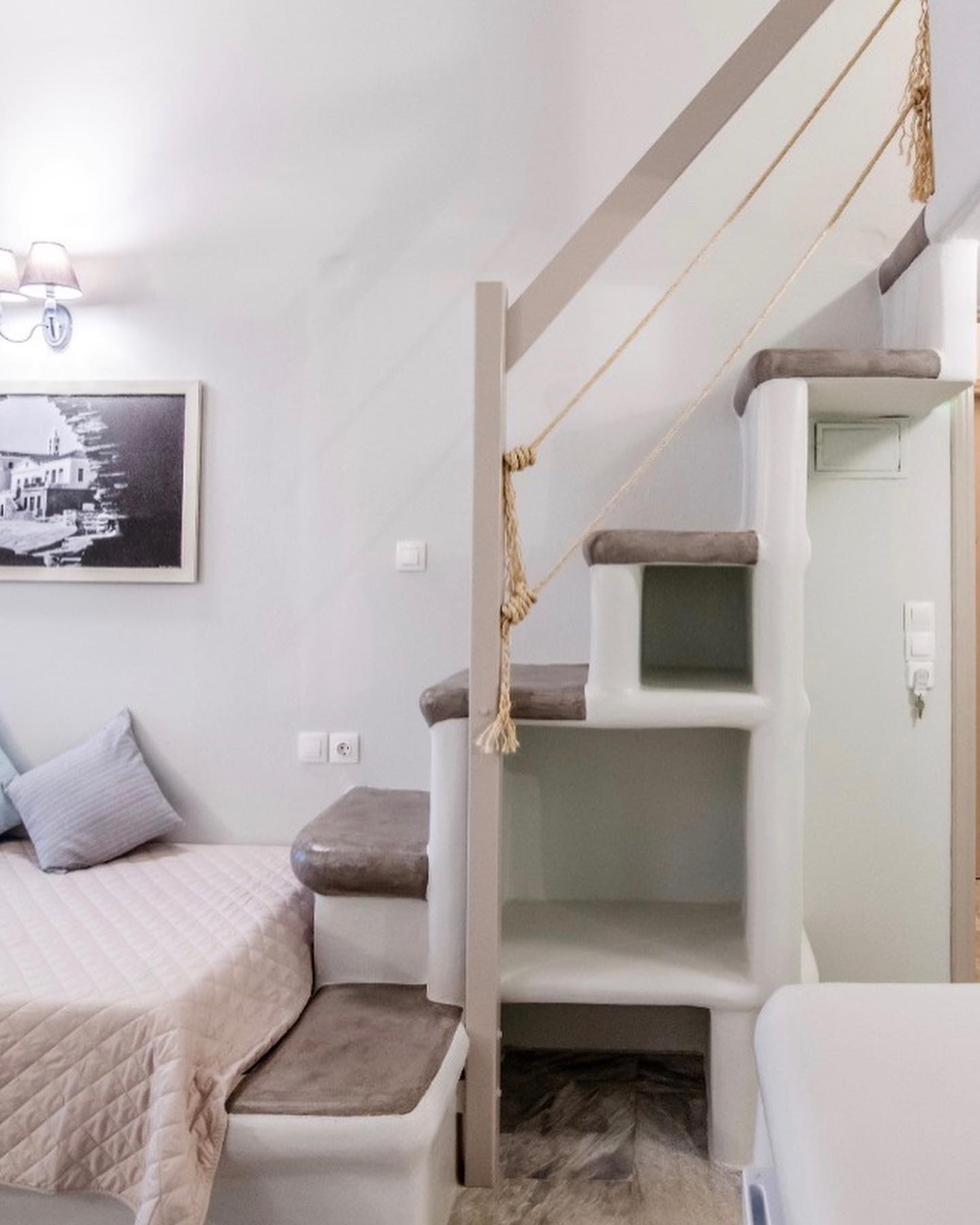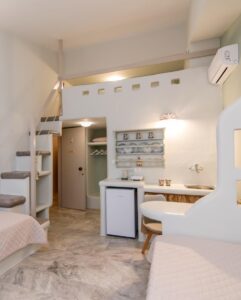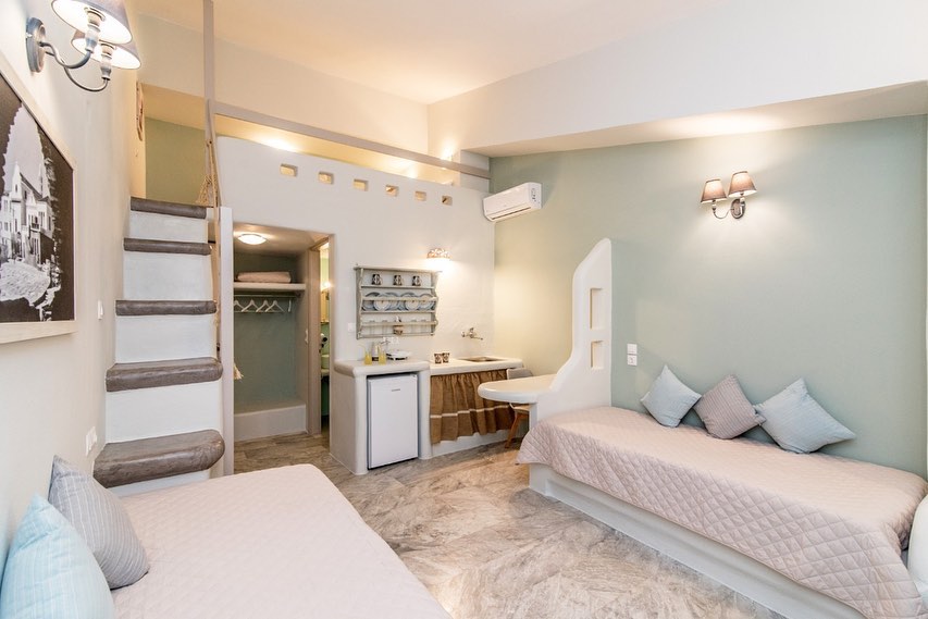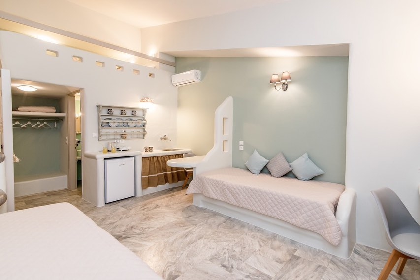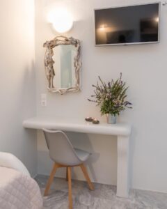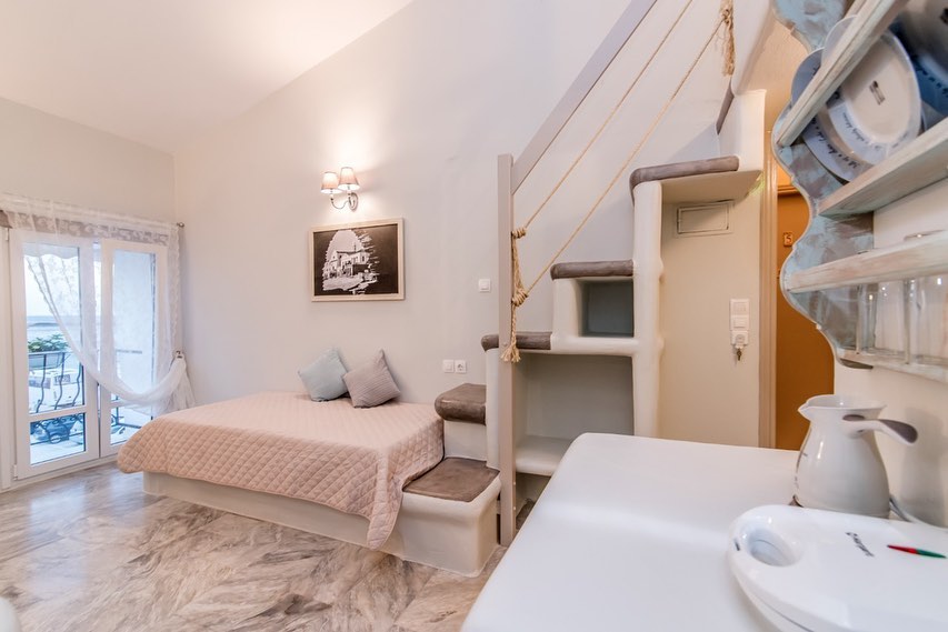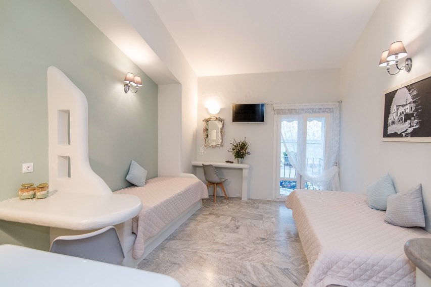 Eίναι ένα από τα πιο ρωμαντικά δωμάτια, ιδανικό για ζευγάρια που θέλουν μια πραγματικά ρομαντική φωλιά για τις πρώτες μέρες της καινούργιας τους ζωής. Αποτελεί μια εξαιρετική, οικονομική λύση για όσους επιθυμούν να μη χάσουν καμία από τις σύγχρονες ανέσεις της υψηλής φιλοξενίας μας. Στα 20 τ.μ. του βρίσκουμε ένα κτιστό υπέρδιπλο και ένα μονό κρεβάτι, κτιστό μπάνιο με ντουζιέρα και ένα μικρό μπαλκονάκι με υπέροχη θέα στην θάλασσα. Οι διακοσμητικές λεπτομέρειες συμπληρώνουν τον άνετο χώρο του και γίνονται ένα υπέροχο δωμάτιο για τις διακοπές σας στη Τήνο. Το Angelo room sea view βρίσκεται στον πρώτο όροφο.